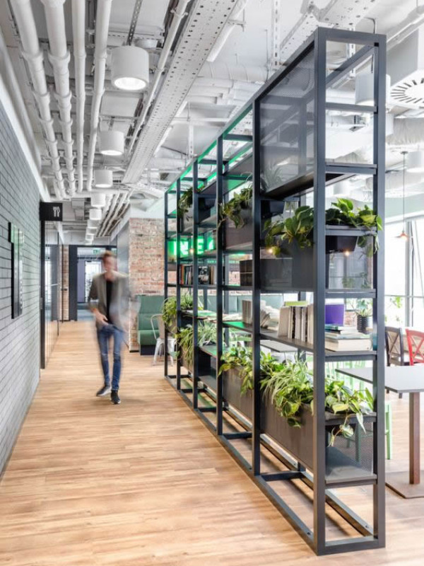 - Вторая: офисная перегородка - стойка, которая зонирует пространство, отделяет рабочую зону от проходной. Перегородка – стеллаж, на котором закреплены горшки с цветами, а также есть классические полки для книг. Перегородка правильной прямоугольной формы, по высоте она не доходит до потолка, тем самым сохраняя воздушность помещения.
